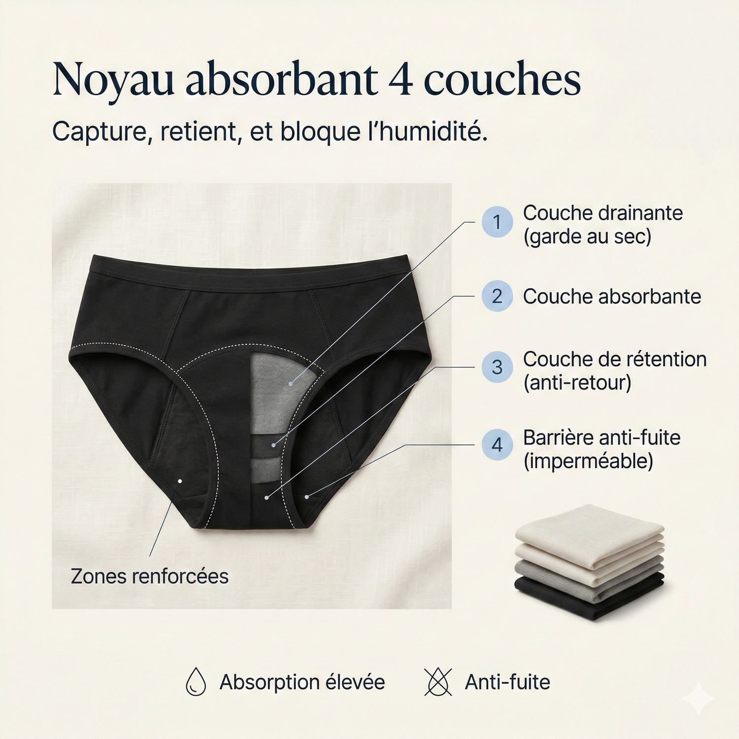 Contrairement aux couches ou protections jetables, cette culotte se porte comme un sous-vêtement normal. Elle est lavable, discrète et pensé pour gérer les fuites sans plastique visible ni sensation médicale.